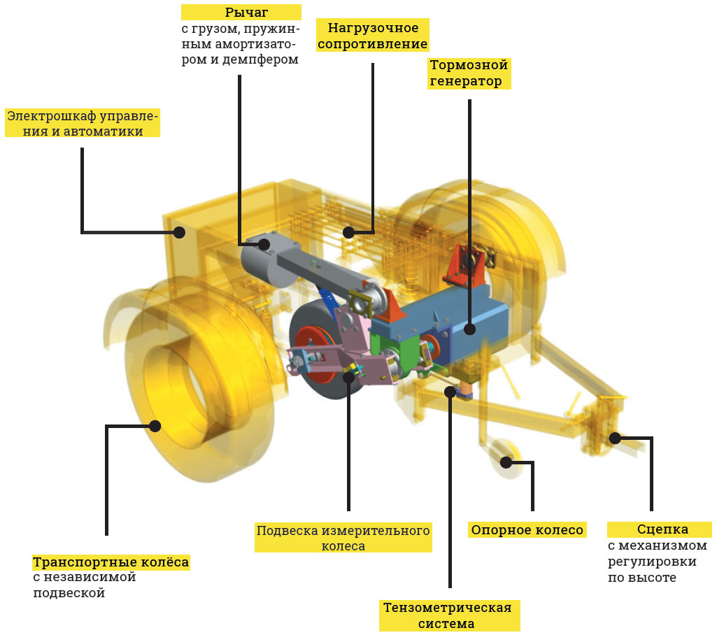 - Независимая рычажная подвеска измерительного колеса c пружинным амортизатором, демпфером и тензометрической системой.